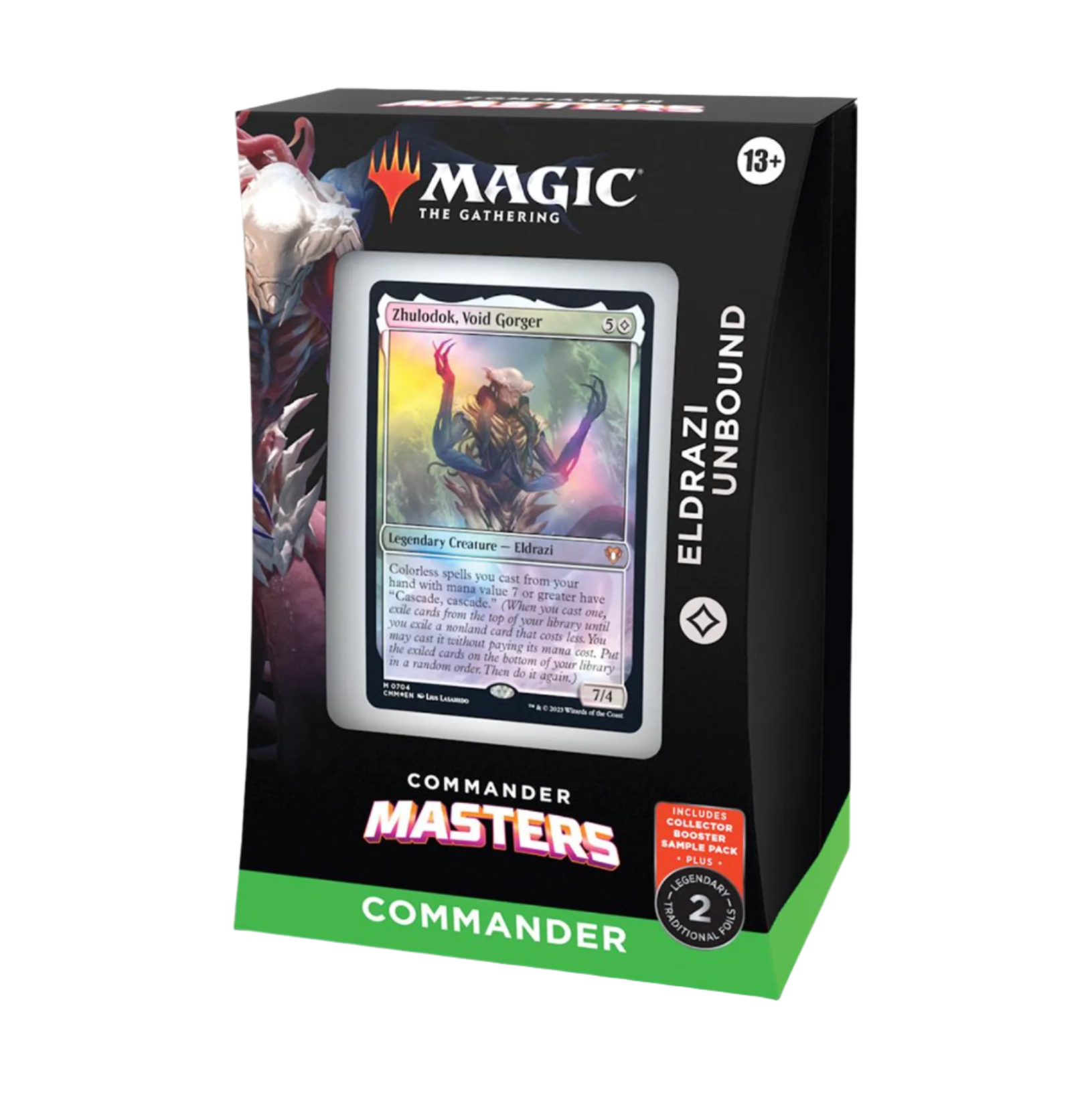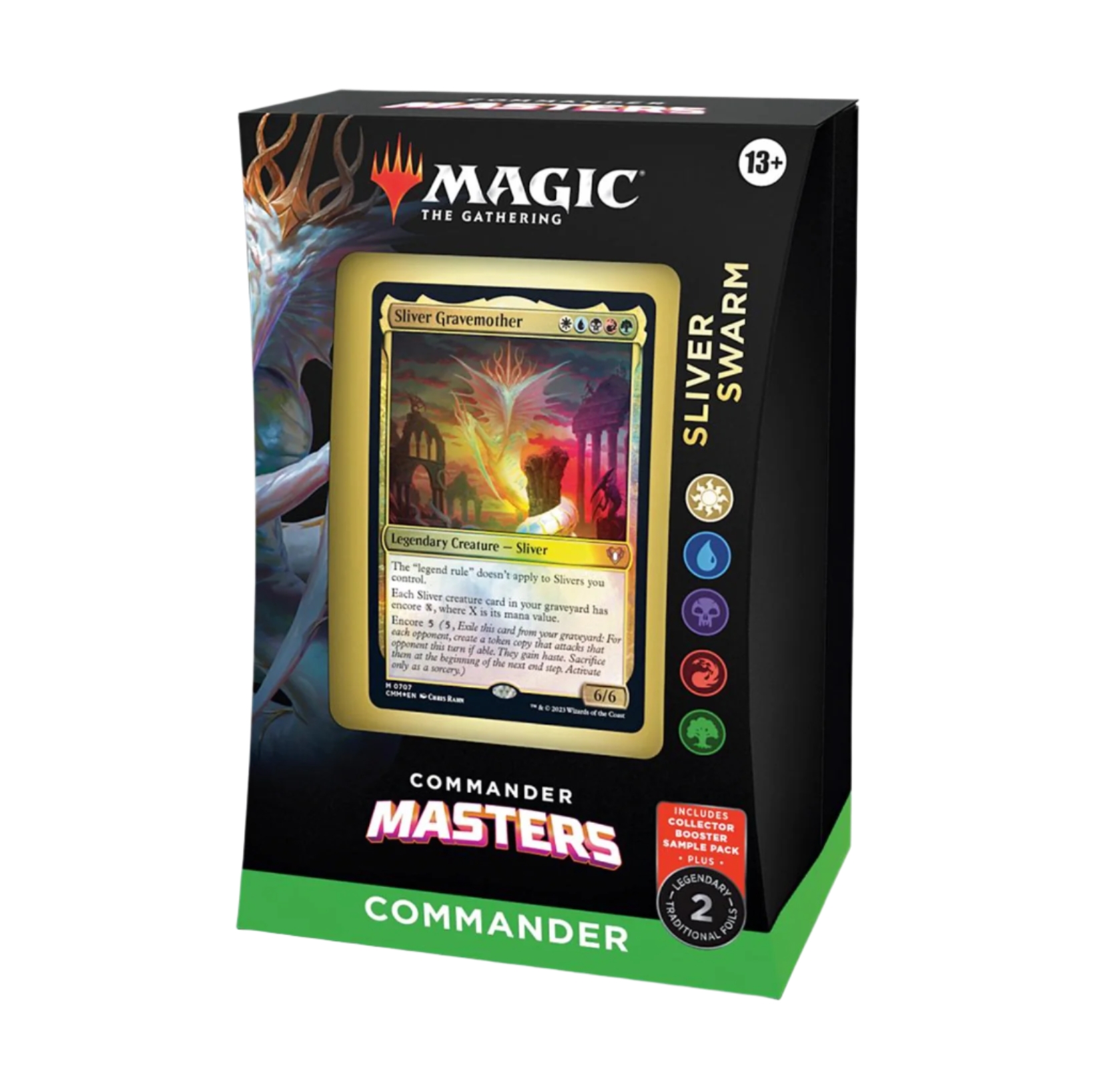 Each Commander Masters Commander Deck set includes 1 ready-to-play deck of 100 Magic cards (2 Traditional Foil Legendary Creature cards, 98 nonfoil cards), a 2-card Collector Booster Sample Pack, 1 foil-etched Display Commander (a thick cardstock copy of the commander card with foil etched into the card’s border and art), 10 double-sided tokens, 1 deck box (can hold 100 sleeved cards), 1 Life Wheel, 1 strategy insert, and 1 reference card.