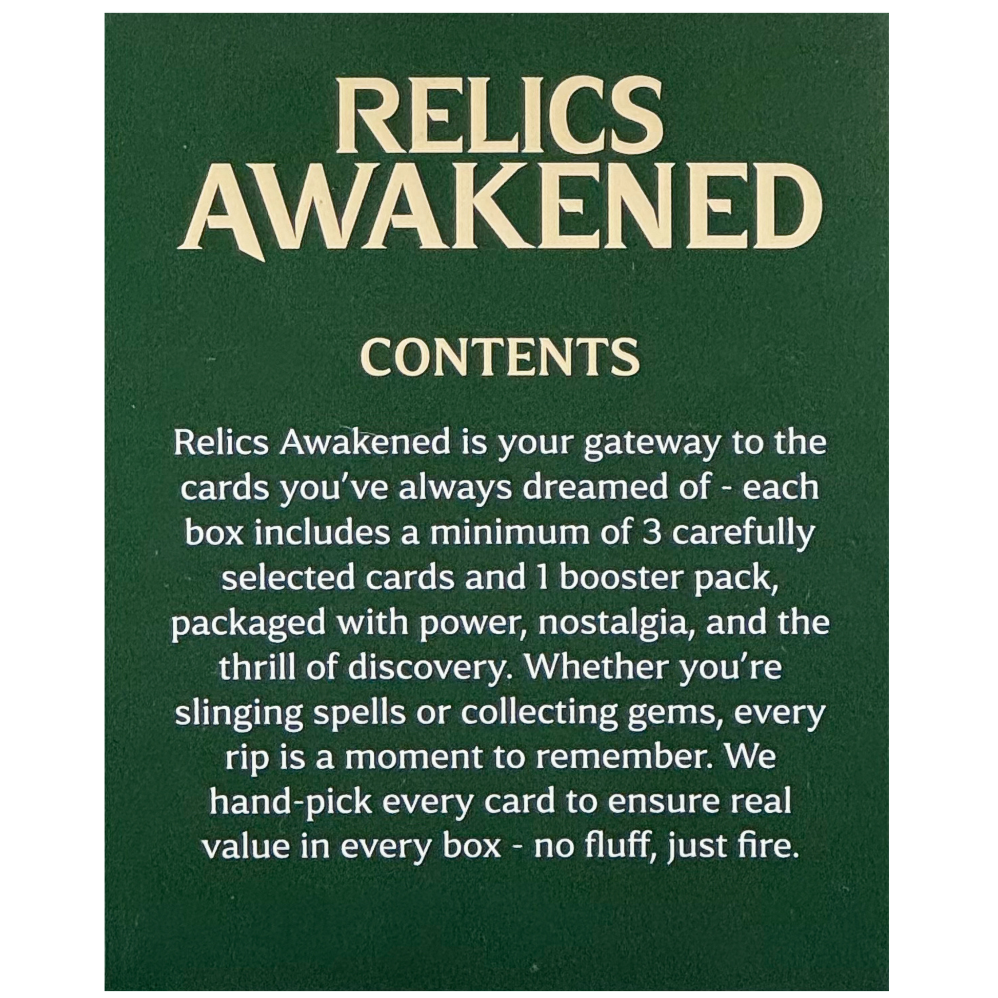 Relics Awakened comes with a minimum of 1 booster pack and 3 cards. All boxes are correlated to give the consumer a great experience and to have something to instantly add into their decks to be playable.